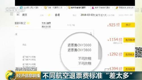 江苏省消费者权益保护委员会副秘书长 居上表示,在飞猪旅行网上,由南京飞香港的票价是925元,起飞前24小时前退票费是3000元,起飞前24小时后退票费为3800元。这一例退票费就是原票价的3倍以上。