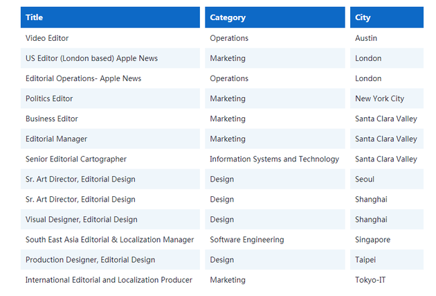 我们在下图中列出了这些职位和工作地点。很明显苹果目前正在招聘有经验的编辑。