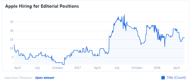 在搜索带有“Apple News”这个关键词的职位描述时,我们发现苹果在2017年12月迎来一轮招聘高峰。苹果希望给Apple News团队添加多个职位,包括产品经理、分析工程师、制作人以及受众开发经理。