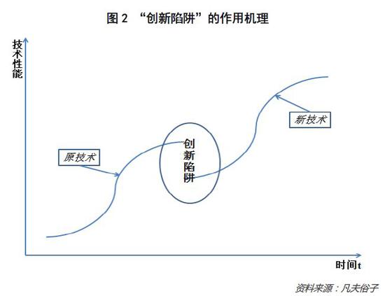 “创新陷阱”正是产生于这种新旧技术的更替过程中(参见图2)。具体来说,对于一家企业,从原有技术轨道跨向新技术轨道是一件不容易的事情;企业越是在自己原有的技术专长上加以创新,便会在原有技术轨道上走得越远;也正因为如此,企业也便越会延滞进入新的技术轨道,进而也越来越遭受旧技术极限的扼制。