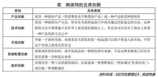 在熊彼特看来,创新包括五种情况,分别为产品创新、技术创新、市场创新、资源配置创新与组织创新,具体如下表:
