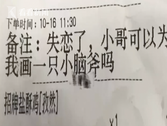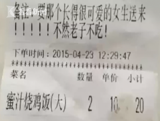送个快递,得争分夺秒,冲锋陷阵,还可能遇到顾客的各种奇葩要求。记者从网上一些外卖小哥分享的订单看到:“失恋了,小哥可以为我画一只小老虎吗”;“要哪个长得女生送来,不然老子不吃!”;“老板,我现在在外地,这是给我男朋友点的,让外卖小哥送餐时看看房间里面有没有女的”;“来的时候要鬼鬼祟祟,不要按门铃,不能让我爸发现我在吃夜宵”;“超市有散装大米,买50斤,再带两个西瓜,不带就差评”。