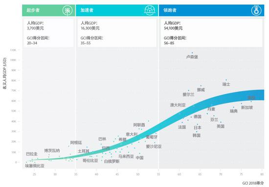 这些国家被划分为三大类型,颜色由浅到深分为:起步者、加速者和领跑者。79个国家的GDP总额占全球GDP的95%。