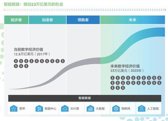 随着人工智能技术与五大使能技术在各行业的渗透、融合,基础联接将演进为智能联接,为创新和经济发展带来前所未有的机遇。智能联接将催生新的商业模式、产品、流程和服务,开启新的经济增长模式,预计将在2025年创造23万亿美元的数字经济价值。