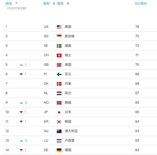美国在2018年的GCI排名中名列第1位,自2015年来一直独占鳌头。