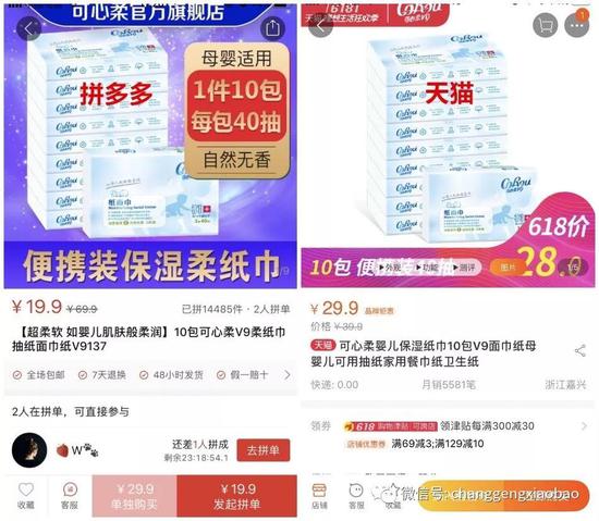 进一步对比两个平台上同系列的所有纸巾产品后,长庚君发现,两个平台上产品详情完全一样的纸巾拼多多拼团价更便宜;而产品详情中拼多多上纸张宽度大5毫米的纸巾,价格比天猫高出3.2元。