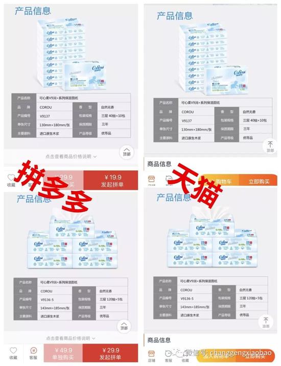 长庚君仔细对比发现,在拼多多和天猫官方店的产品介绍中,上述产品纸巾材质、工艺完全一样,但在产品信息上略有不同——拼多多标明了产品编号,天猫上却没有;拼多多上纸张大小为148*185(mm),天猫上则为143*185(mm),纸张宽度相差了5毫米。