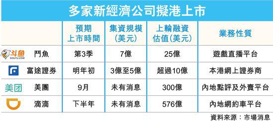 本周初也盛传腾讯有份投资的点评及外卖平台美团最早将于今年9月来港上市,或将寻求600亿美元估值,远高于其上一轮融资300亿美元估值。
