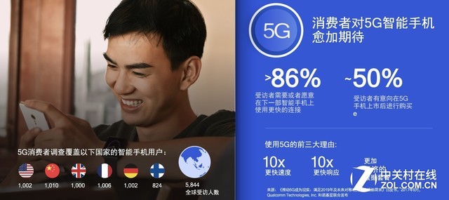 高通的一份调查显示,86%的受访者需要或者愿意在下一部智能手机上使用更快的连接;50%的受访者有意向在5G手机上市后进行购买,消费正正在呼唤5G手机的早日到来。