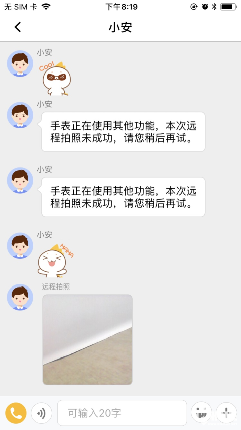 此外,借助小安电话手表A1可视版配备的摄像头,家长可以使用远程拍照功能来了解孩子周围的情况。点击该功能后,手表会自动拍摄一张照片并回传到家长的App中。不过,当手表处于其他程序中时该功能有时会无法使用,这一点仍需改进。