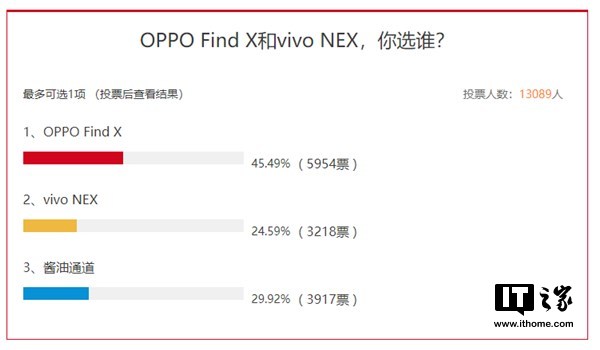 IT之家曾在6月20日做过一次关于OPPO Find X和vivo NEX的投票调查,截稿之前,在超过1万3千人的投票结果中,有45.49%的用户选择了Find X,另有24.59%的选择了vivo NEX。