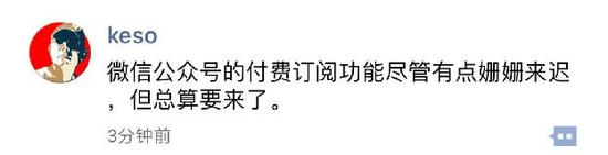 随后 keso 发布了一条朋友圈,称‘微信公众号的付费订阅功能尽管有点姗姗来迟,但总算要来了。’