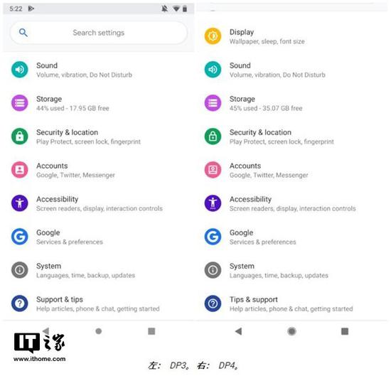 略微意外的是,谷歌在DP4版本当中,继续对材料设计(新浪手机注:应该是Material Design)进行了优化,主要体现在部分图标UI当中。对比新旧版本的截图可以发现,在新版Android P当中,谷歌使用了更多的“线”元素代替了之前的“块”元素,比如说“设置”中的“备份”、“多用户”和“系统升级”等图标。