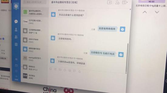 当记者声明想要一张北京移动的电话卡,其它电信和联通正规卡各一张时,他告诉记者要再追加50元,一共750元。记者最终把钱通过微信转给卖家。但这个卖家很警觉,过了两天仍然迟迟不肯发货。在记者的追问下,他最终说出了自己的顾虑。