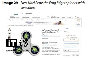 报告还指出,更为严重的是,还有一些商品是针对儿童的,比如纳粹主题的佩佩蛙指尖陀螺和带着燃烧十字架的儿童连体衣等。报告也指出,亚马逊的平台上也还有有仇恨团体的Kindle电子书和流媒体音乐可供购买。