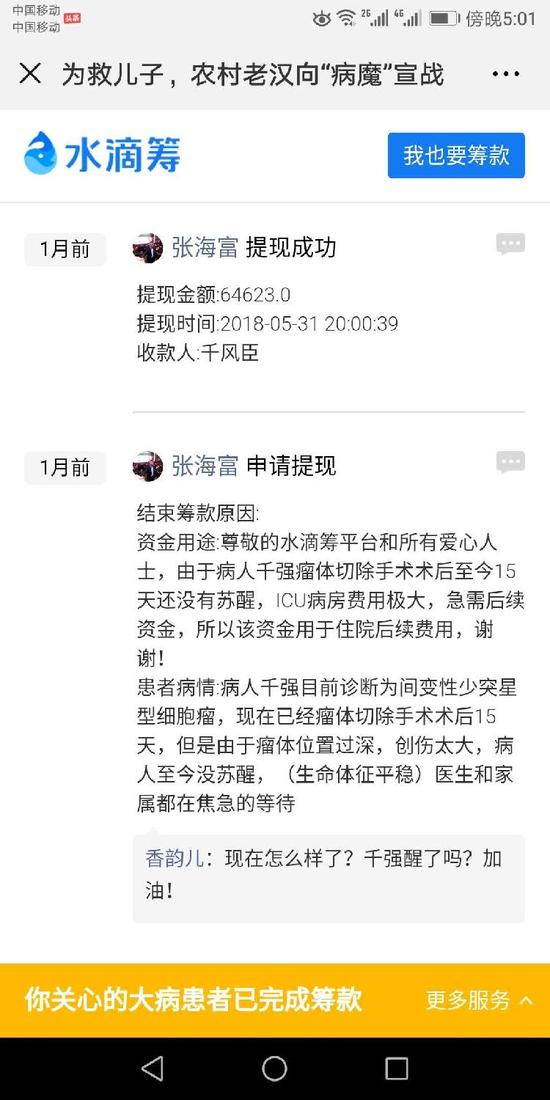 随后,千强的家人又通过“水滴筹”平台,申请了募捐并通过了审核。