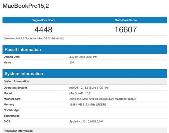近日网络上流传着一张 Geekbench 跑分图,有可能来自苹果即将发布全新 MacBook Pro。这款全新 MacBookPro 15,2 机型搭载了一枚英特