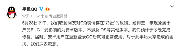 新浪手机讯 5月28日晚间消息,手机QQ官方微博回应了此前曝光的安卓版手机QQ中存在恶意彩蛋的情况,官方表示所为彩蛋属于产品Bug,预计于今