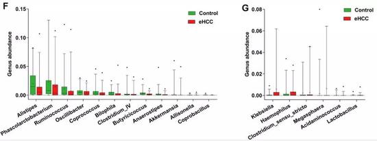 与健康人(绿)相比,早期肝癌患者(红)几个属的肠道微生物丰度的变化,F为减少的12个属,G为增加的6个属