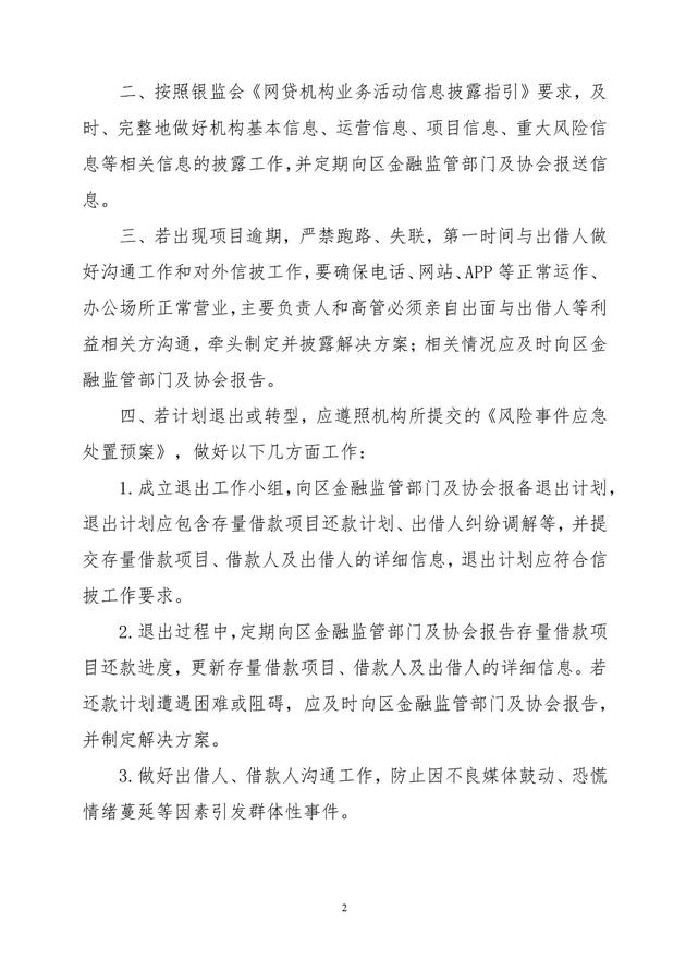 7月16日上午消息,今日,广州互联网金融协会官网发布《关于进一步做好网贷机构风险防范及稳妥退出工作的通知》。《通知》中要求会员单位出现项目逾期时,不得跑路、失联,第一时间与出借人做好沟通工作,确保电话、网站、App等正常运作、办公场所正常营业,主要负责人和高管必须亲自出面与出借人等利益相关方沟通,并制定合理有效的还款计划;拟退出或转型的机构,应遵照《风险事件应急处置预案编写说明》,及时向相关监管部门报备和公布退出计划及进度,并做好出借人沟通工作。