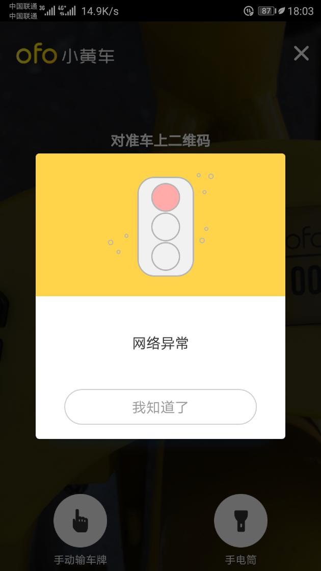 今日晚间,不少网友在微博上反映ofo疑似出现故障,扫码提示网络异常,无法开锁。并且连扫好几辆车都无法开锁。该异常在不少城市出现。