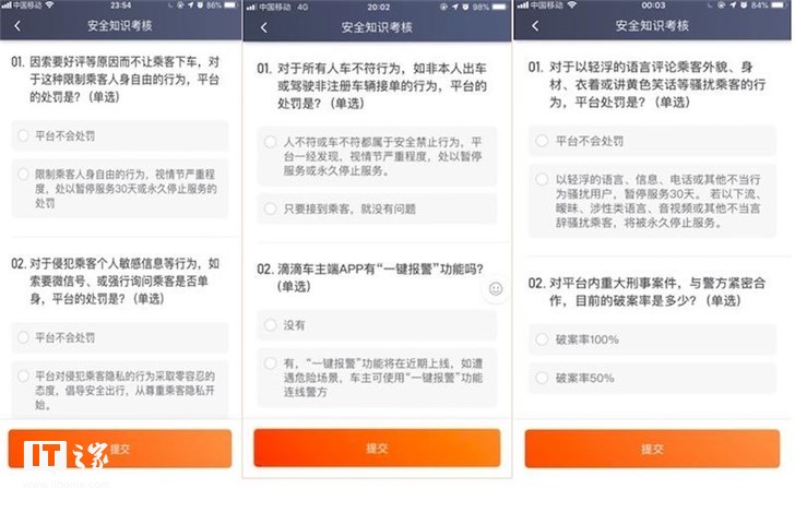 据了解,今天起持续十天,滴滴司机们每天打开车主端App,除了要进行人脸识别外,还需要参与安全知识问答。每次考试包括两道选择题,两题均回答正确才算通过,如果两题中有一题回答错误则为考试失败,司机需要重新考试直到通过,才能正常出车。