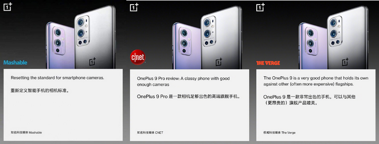 销量走高的背后是市场对一加 9 系列产品实力的认可。一加 9 系列发布后,收获了国外多家科技媒体的高度评价。知名科技媒体 Mashable评价:重新定义智能手机的相机标准;CNET则指出:OnePlus 9 Pro是一款相机足够出色的高端旗舰手机;权威科技媒体 The Verge更是直接称OnePlus 9 是一款非常出色的手机,可以与其他(更昂贵)旗舰产品媲美。