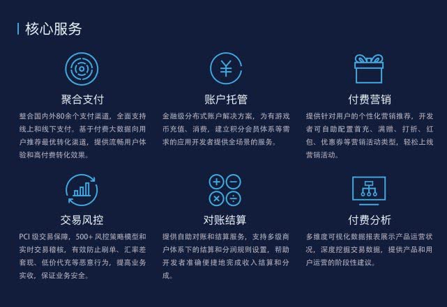 为了更好的助力游戏实现全球商业化,腾讯计费自研开创五大技术平台,提供聚合支付、账户托管、付费营销、交易风控等六大核心服务,实现游戏商业化闭环,极大减少游戏开发运维成本。